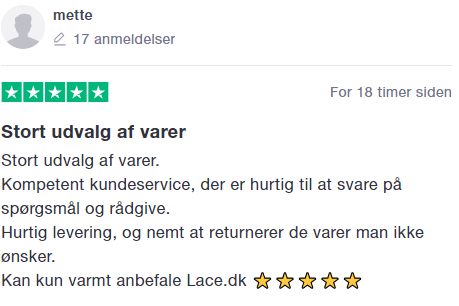 Spørgsmål? E-Mail: service@lace.dk Telefon: 70 21 10 84 |