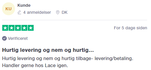 Spørgsmål? E-Mail: service@lace.dk Telefon: 70 21 10 84 |